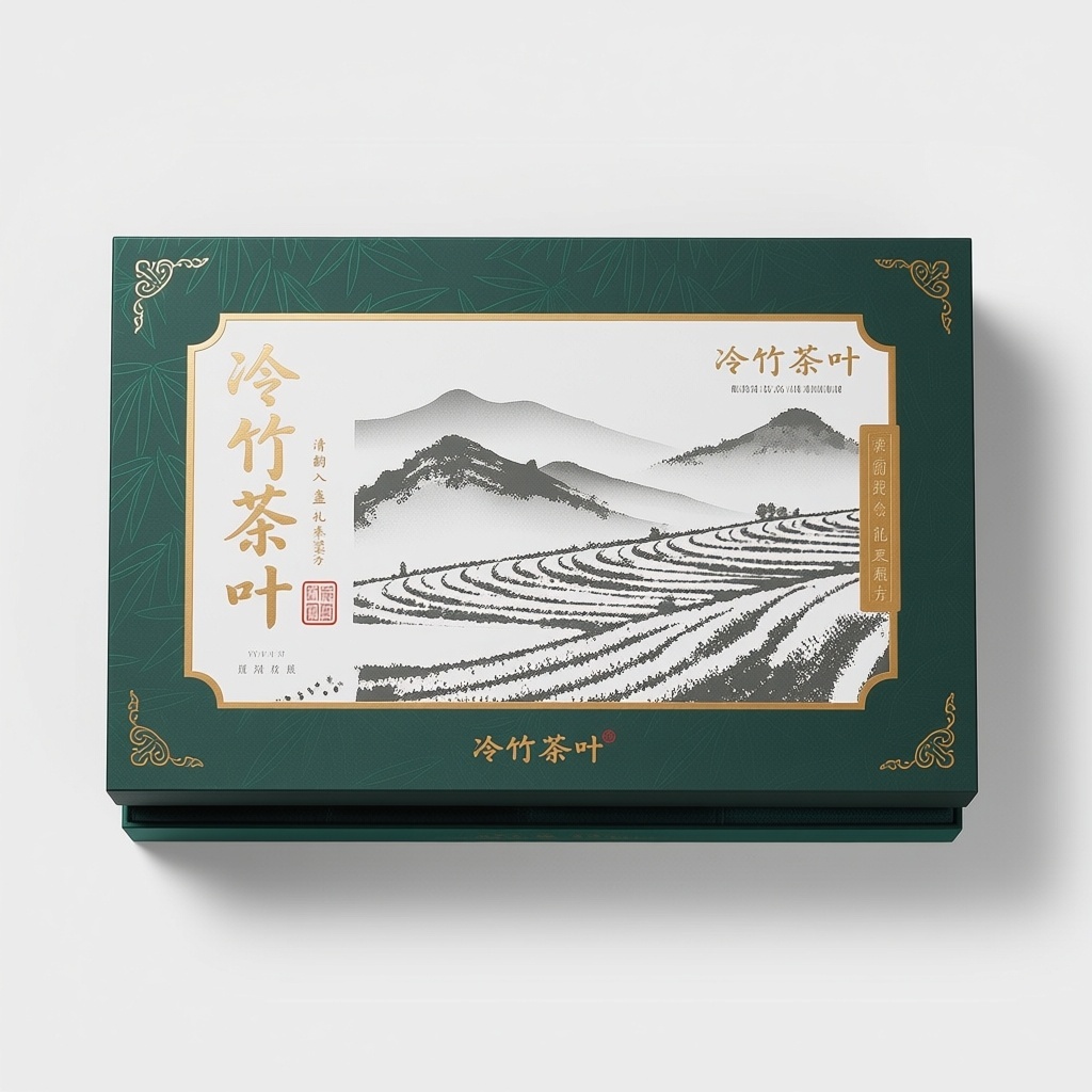 - **设计元素**:哑光特种纸基底,背景层为暗纹竹节纹理;主视觉为手绘感水墨茶田远山图,叠加浮雕凹凸茶田肌理;品牌书法字与印章采用全覆盖烫金+局部击凸工艺;四角压印云纹边框,内衬丝绒材质带同色系竹影暗纹。