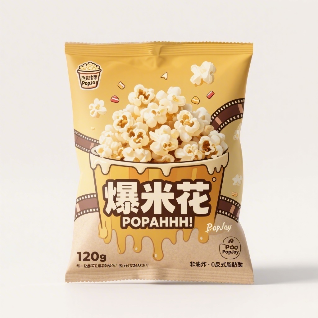 - **设计元素**:背景层为暖黄渐变模拟爆米花堆叠光影;主图案为夸张卡通风巨型爆米花从复古爆米花机喷涌而出,飞溅星形糖粒与胶片齿孔环绕装饰;底部奶油滴落纹理线条增强食欲感;左上角嵌入爆米花桶造型小图标承载“热卖推荐”字样;整体材质呈现哑光覆膜牛皮纸温润防油质感。