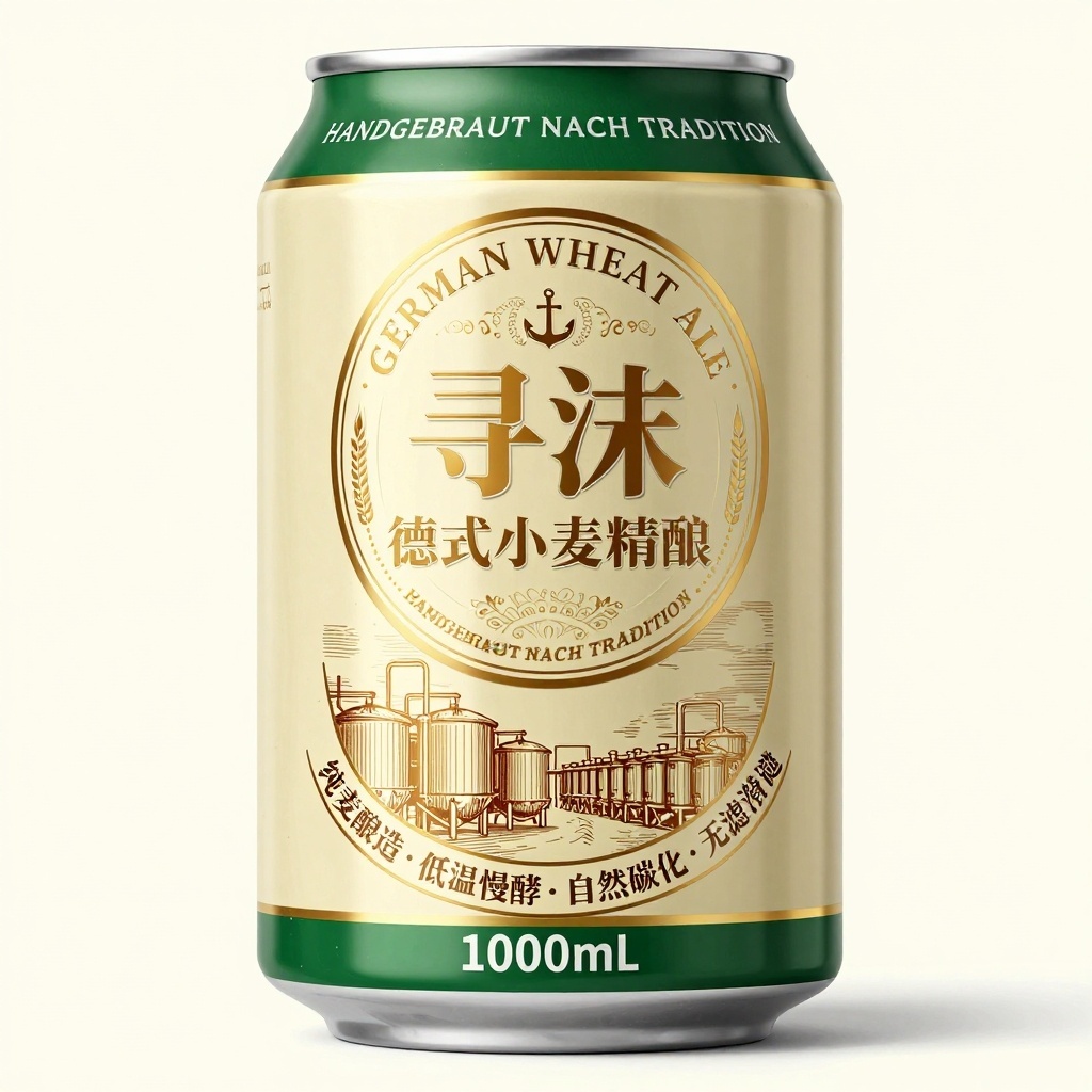 - **包装主视觉面排版**:以文字为主式排版——中部复古徽章为视觉锚点,顶部英文“GERMAN WHEAT ALE”以衬线体小字居中压于徽章上缘描金边线;中间“寻沫”品牌名采用粗衬线浮雕烫金字垂直居中,“德式小麦精酿”副标题紧随其下缩小字号对齐;下方线稿酿酒场景横向铺底,纯麦卖点四字短语“纯麦酿造·低温慢酵·自然碳化·无滤澄清”沿场景底部弧形排布;净含量“1000mL”与酒精度等参数精准对齐罐体最底端,全版形成由上至下严谨阅读节奏,徽章外圈双层描金边框强化仪式感与聚焦力。