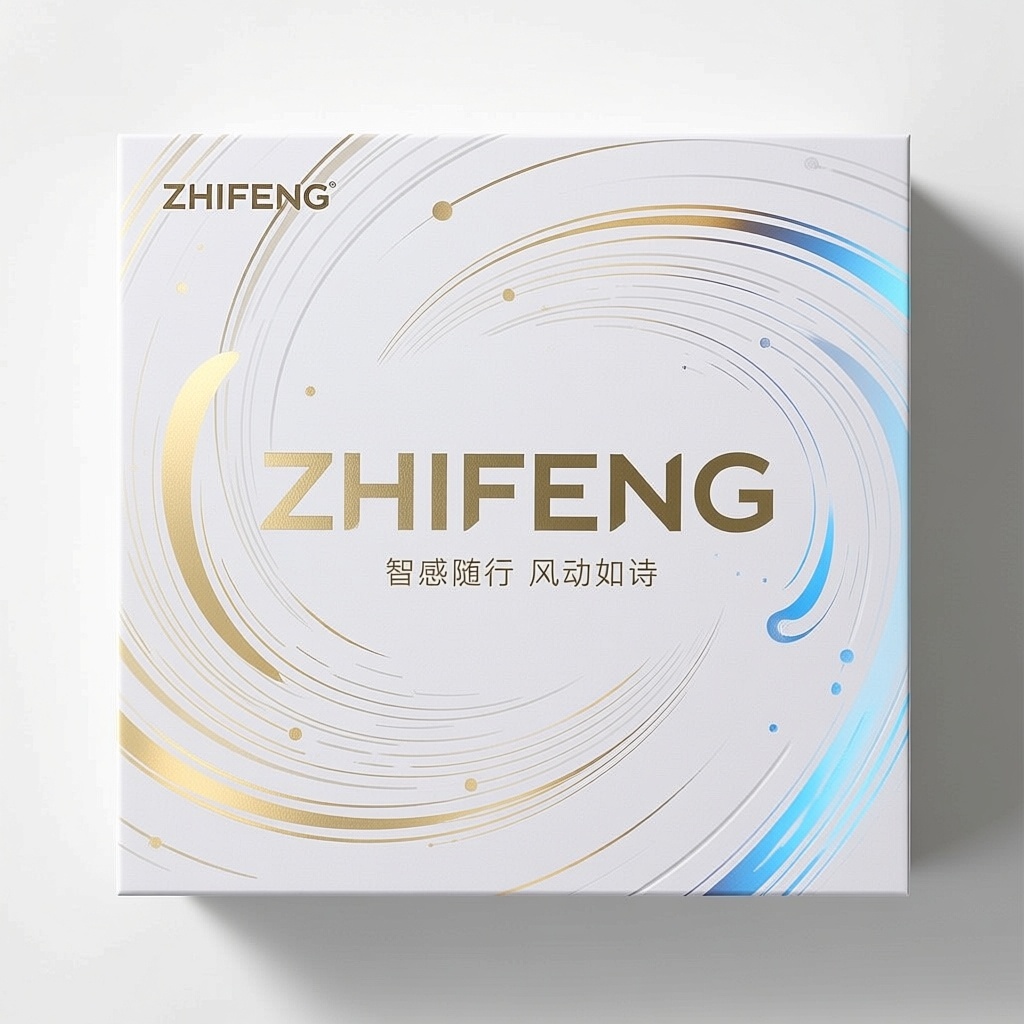 - **包装主视觉面排版**:以文字为主式排版(“ZHIFENG”超大字号居中占据视觉核心,字母笔画间嵌入极细动态风粒子轨迹线,宣传语以纤细衬线体低调置于品牌名正下方;背景采用抽象化的螺旋气流环带作为纹理式环绕装饰,从中心向外渐隐,强化风感科技意象而不喧宾夺主)