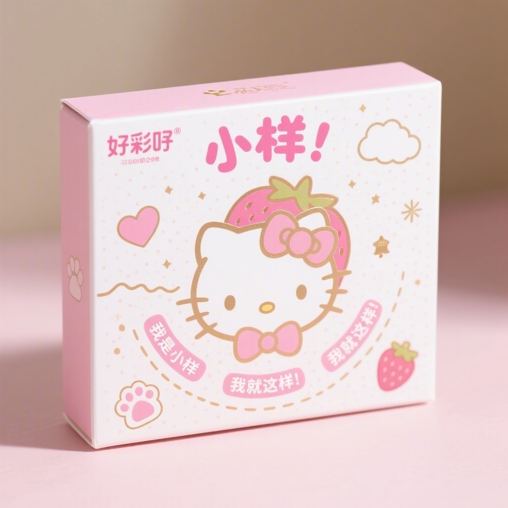 - **设计元素**:背景层为柔雾白哑光纸基底带细微珠光颗粒;主图案为Hello Kitty经典侧颜+蝴蝶结轮廓线描;装饰图案含小爱心、糖果云朵、星星点阵;装饰线条使用粉色波浪描边与金色虚线框;小图标包括爪印、草莓、铃铛;材质选用300g特种艺术纸,触感柔滑略带绒面质感