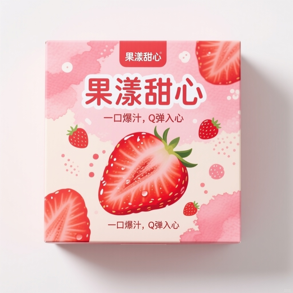 - **设计元素**:背景层为水彩晕染的粉红色渐变;主图案为高清写实草莓切面带水珠光泽;点缀元素包括手绘风格小草莓图标、波点与柔光粒子纹理;包装材质为哑光覆膜纸板,触感柔和略带磨砂