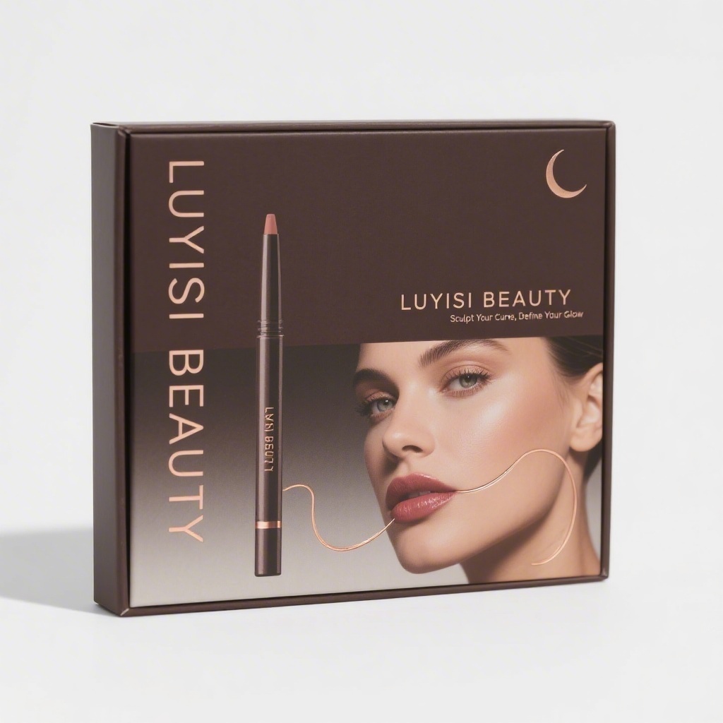 - **包装主视觉面排版**:左右排版(文字在左图案在右),左侧竖排“LUYISI BEAUTY”垂直居中,距左边缘0.8cm,采用细长无衬线字体;右侧偏中下嵌入高精度欧美模特唇部特写图(占宽40%、高25%),右上角配置1.5cm极简新月线条,整体通过非对称留白形成视觉动线,左轻右重、上空下实,营造高级呼吸感