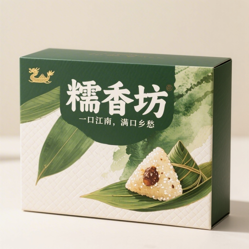 - **设计元素**:背景层为高清粽叶肌理叠加水彩晕染效果;主图案为手绘风格剥开粽叶露出晶莹糯米与馅料的特写插画,置于右下角作为视觉落点;左上角点缀金色龙舟剪影小图标;包装采用哑光特种纸,表面有细微压纹模拟竹编质感