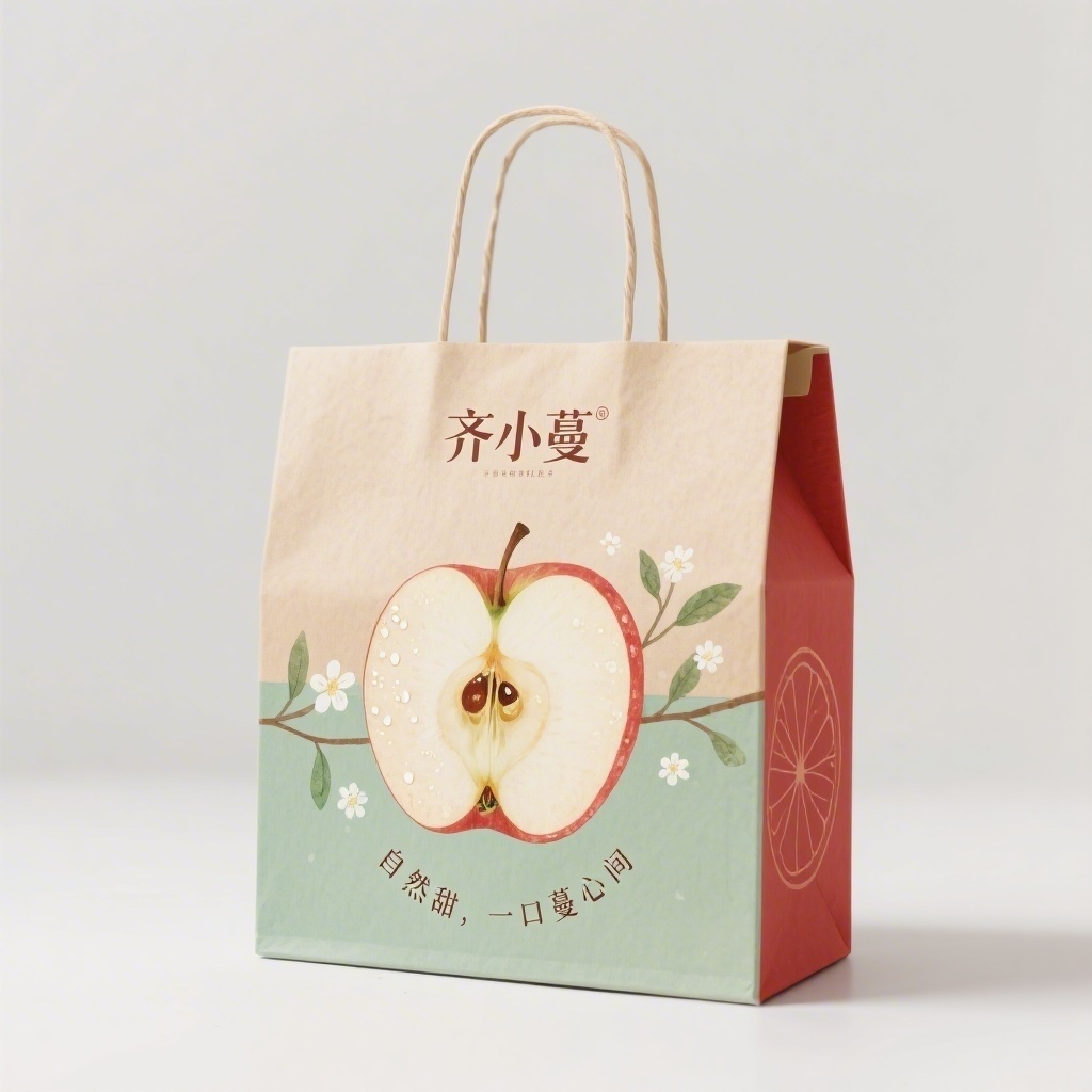- **设计元素**:背景层为浅米色牛皮纸肌理;主图案为水彩风格苹果横切面,果肉晶莹带水珠细节;装饰元素包含枝叶线条与散落的白色小花;品牌名使用粗衬线字体加描边处理,宣传语用细圆体;手提袋侧面压印极细柚子轮廓暗纹。