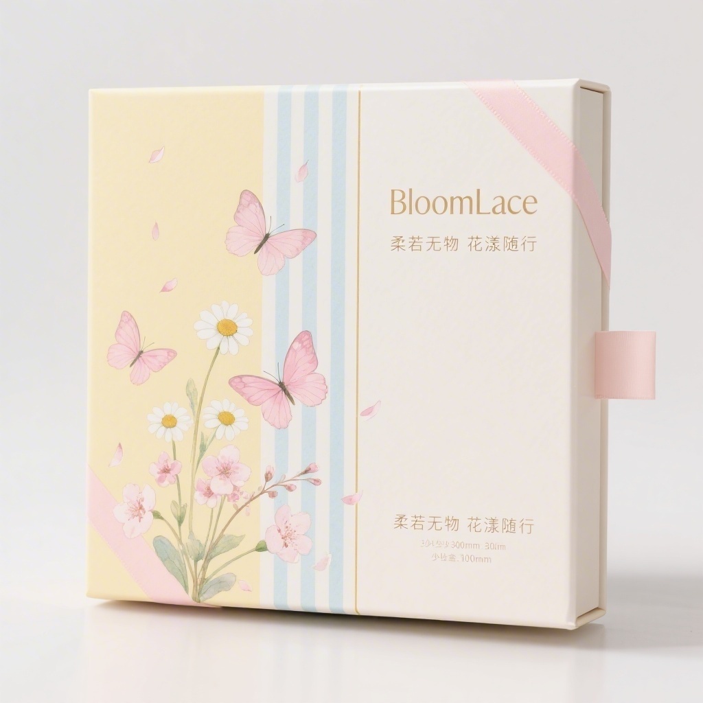 - **设计元素**:背景层为柔雾感奶黄特种纸,主图案采用低饱和度水彩晕染的小雏菊、樱花枝与飘散花瓣,浅蓝米白条纹作纵向节奏引导,蝴蝶使用珠光粉局部UV工艺;右侧文字区压印极浅樱花暗纹,盒盖边缘包覆0.5cm宽马卡龙粉缎带