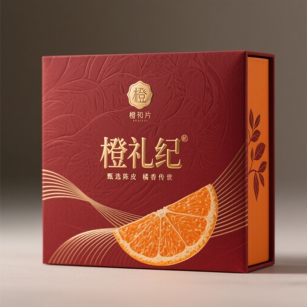 - **设计元素**:哑光触感特种纸基底,主视觉区嵌入浮雕橘皮肌理图案,搭配极细金属线条勾勒轮廓;侧边饰以抽象化柑橘枝叶剪影图标,盒盖中央压印品牌LOGO徽章